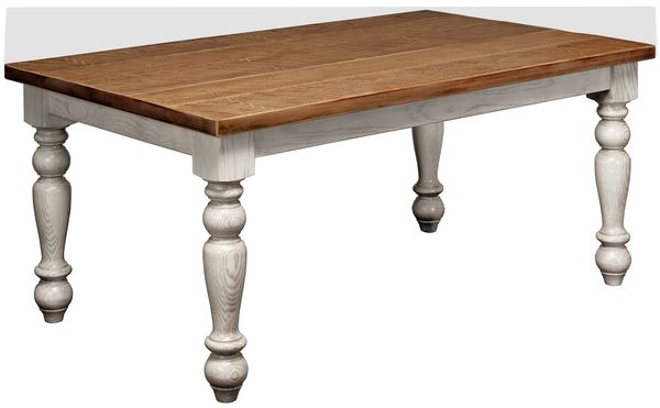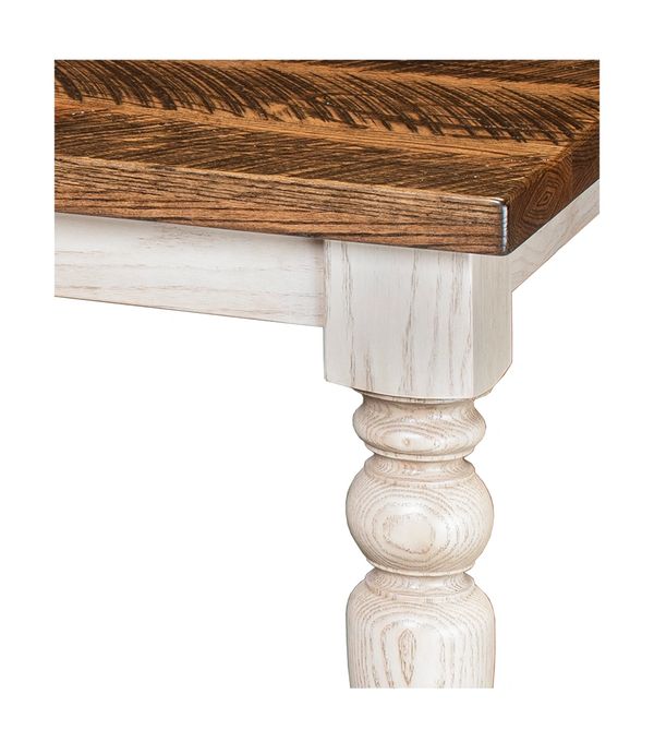 7 Piece Set. Roughcut Oak medium tone Top & distressed white base. Table 72 L x 42 W x 30 H